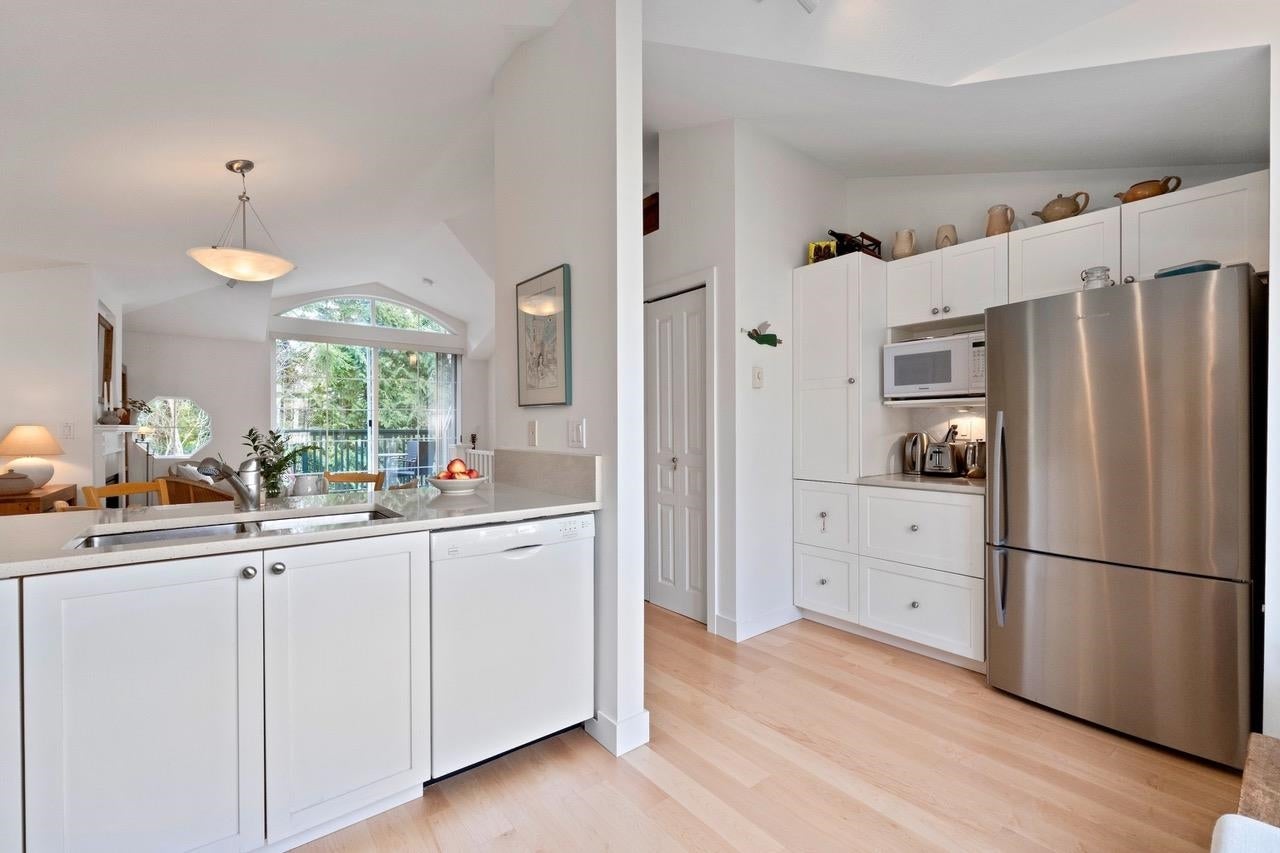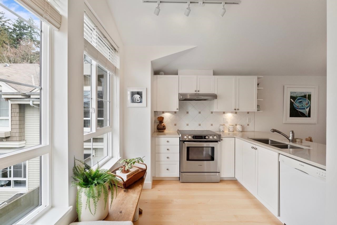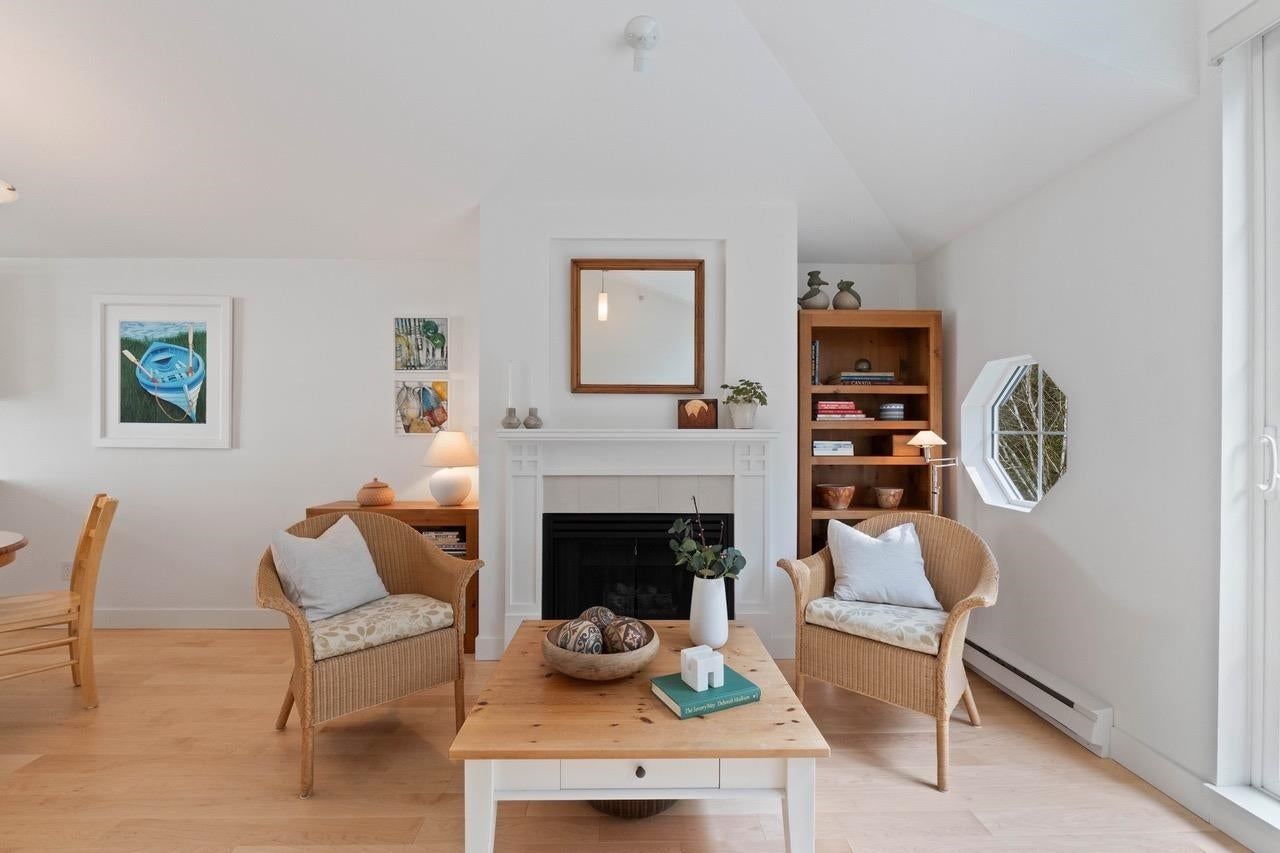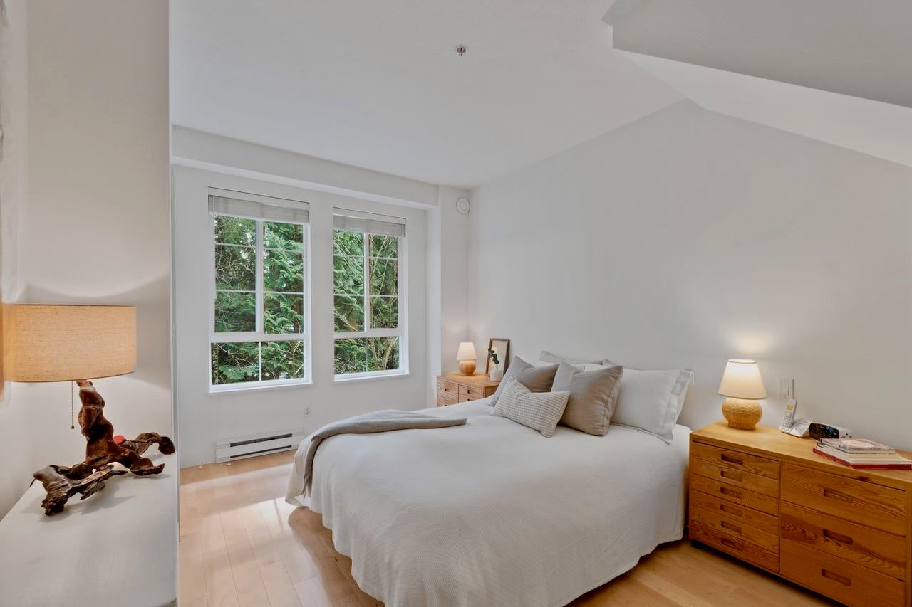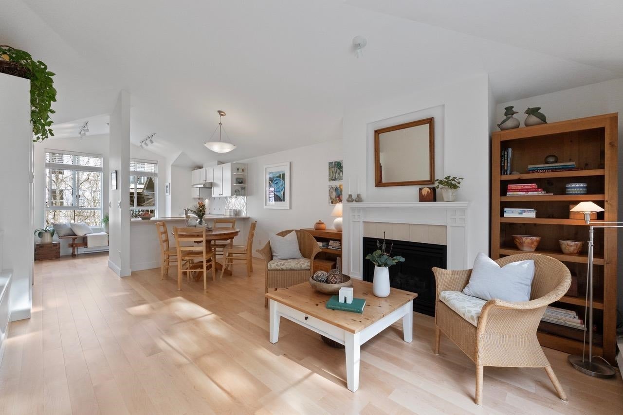 The Pemberley UBC. Rare find. Much sought after unique location. Live in this light filled t/h w/beautiful views to nature. Walk serene forest trails in Pacific Spirit Park Near schools, shopping, restaurants & UBC academic, recreation, & cultural facilities. 2 Br, 2 Bth w/ vaulted ceilings & large windows overlooking the landscaped award winning courtyard, w/ gorgeous Katsura & magnolia trees & flowering shrubs. High quality h/w floors & wool carpet on the stairs, 9' ceilings on lower level & recently painted. Baths & kitchen renovated w/ quartz countertops, under mounted sinks & Grohe fixtures. The unit also has updated lighting, cozy gas f/p, private Lrm deck. Extra storage in the unit, 2 parking, EV charging, pets ok, storage locker & fibre optic avail.