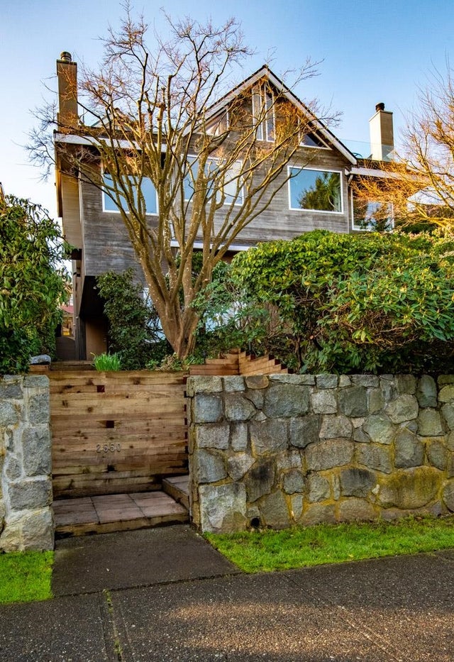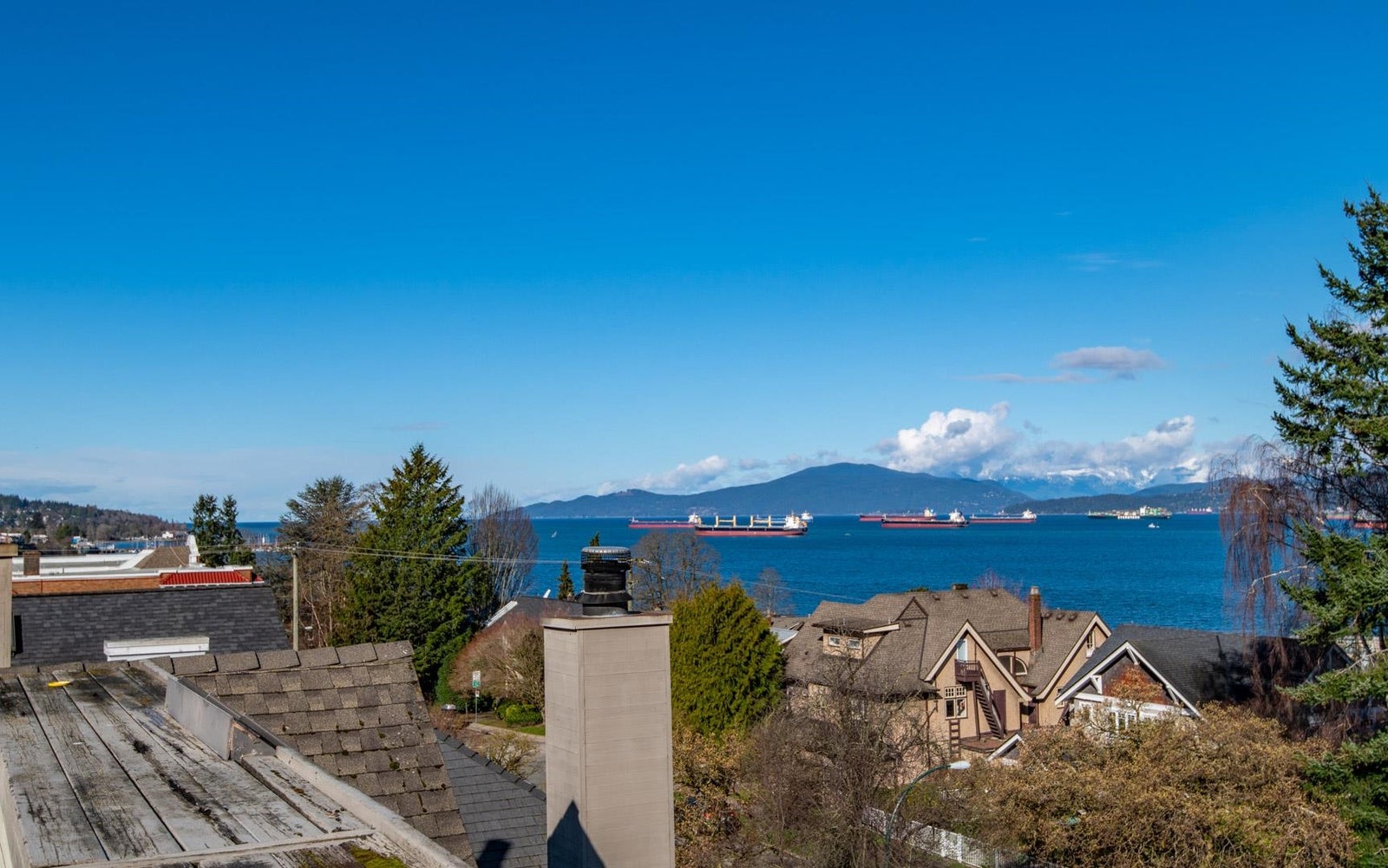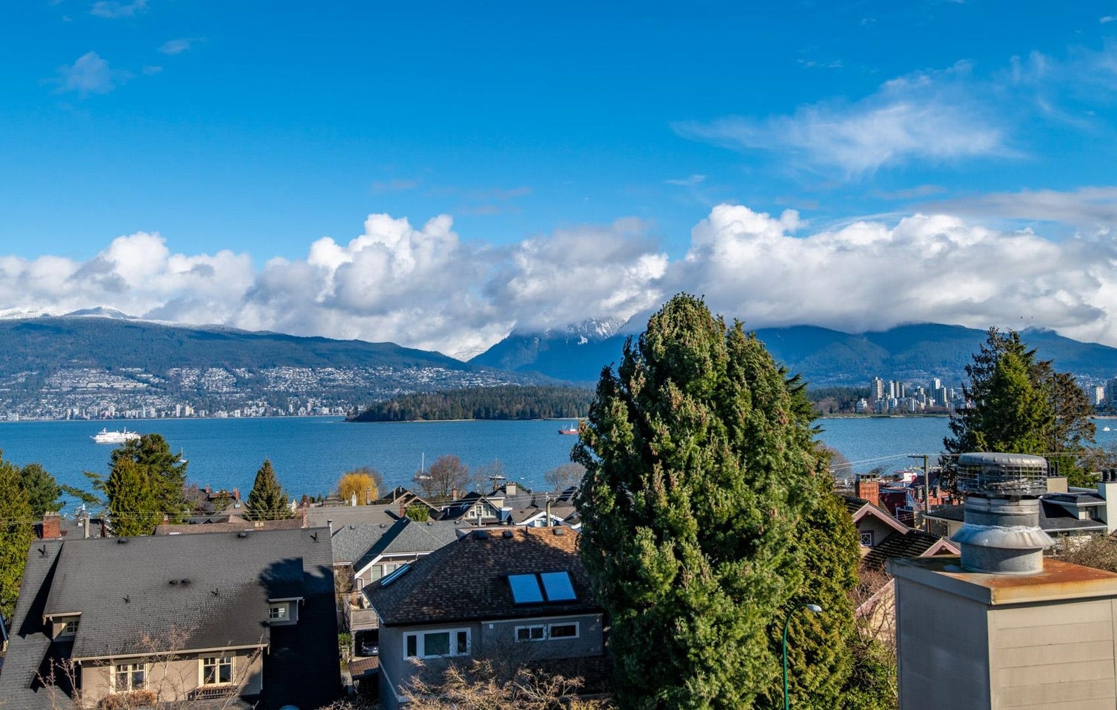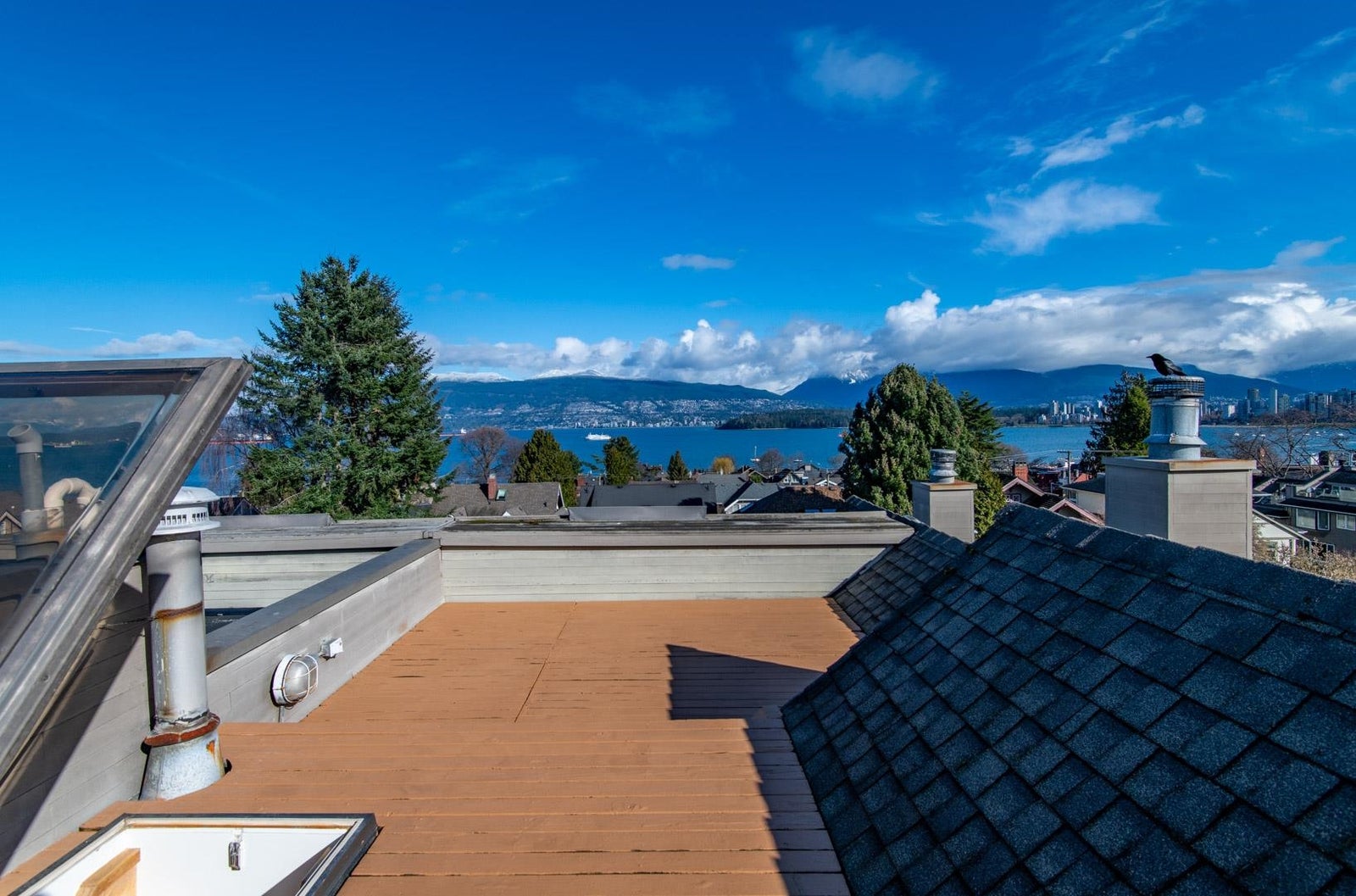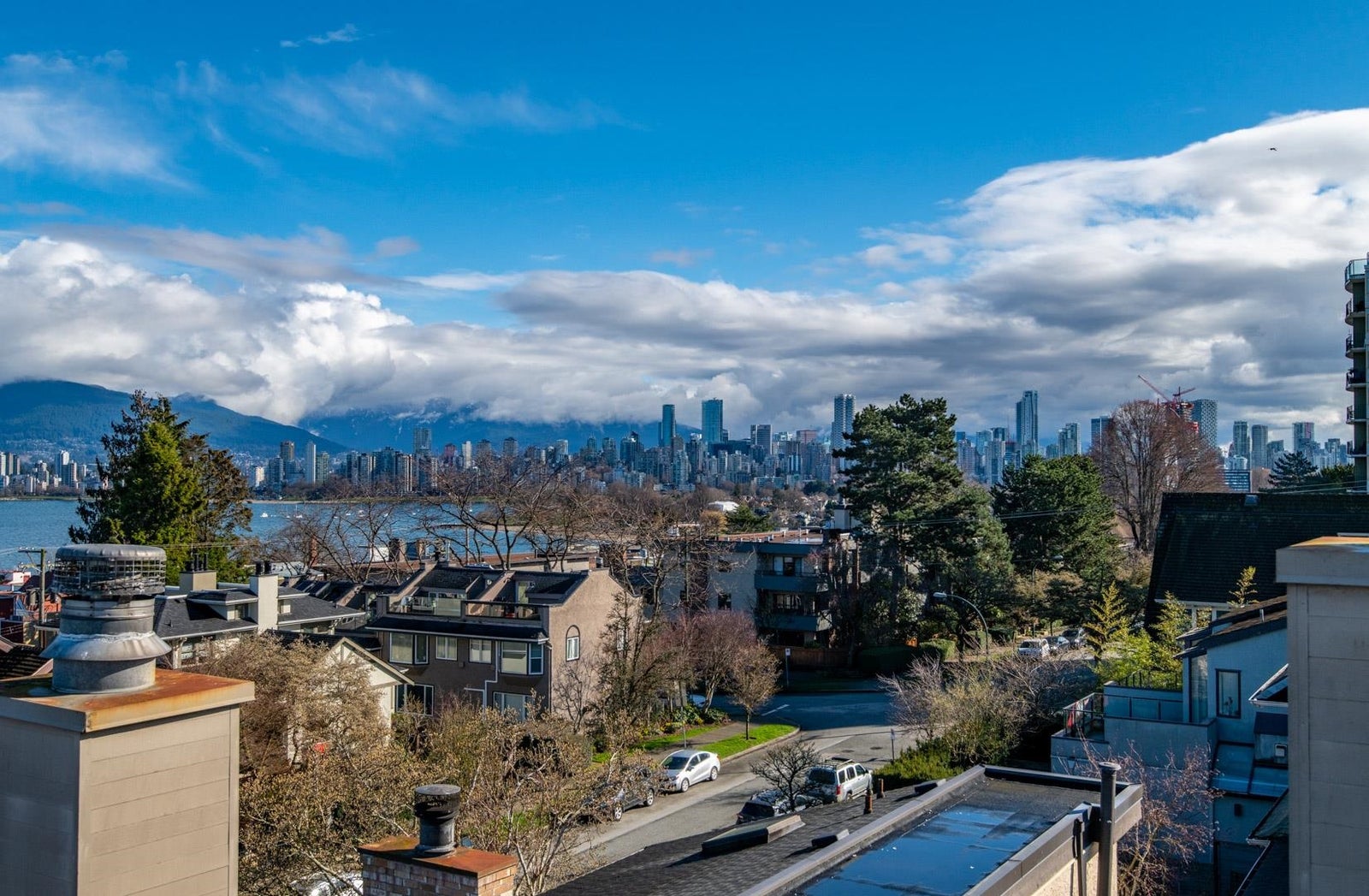 This architect designed, west coast modern, 1/2 duplex w/ spectacular views is on a 4 level split plan w/ 2400 s.f., 3brs, 4bths, open plan, soaring ceilings & huge windows & skylights for abundant natural light. The bright kitchen w/ fabulous views is ready for your creative touch w/ room for high end appliances, cabinets, island & countertops. The MBR has high ceilings, lots of closets, a huge enste bath & french doors to a priv. garden patio. It features radiant hot water heating w/ a gas boiler & 2 domestic HW tanks, a large crawl space for storage plus a garage & carport. It has oak HW flrs, is rough in for an elevator & 3 decks gives outdoor space for entertaining or watching fireworks. Walk to 4th ave., Kits beach bike path & transit to UBC & downtown.