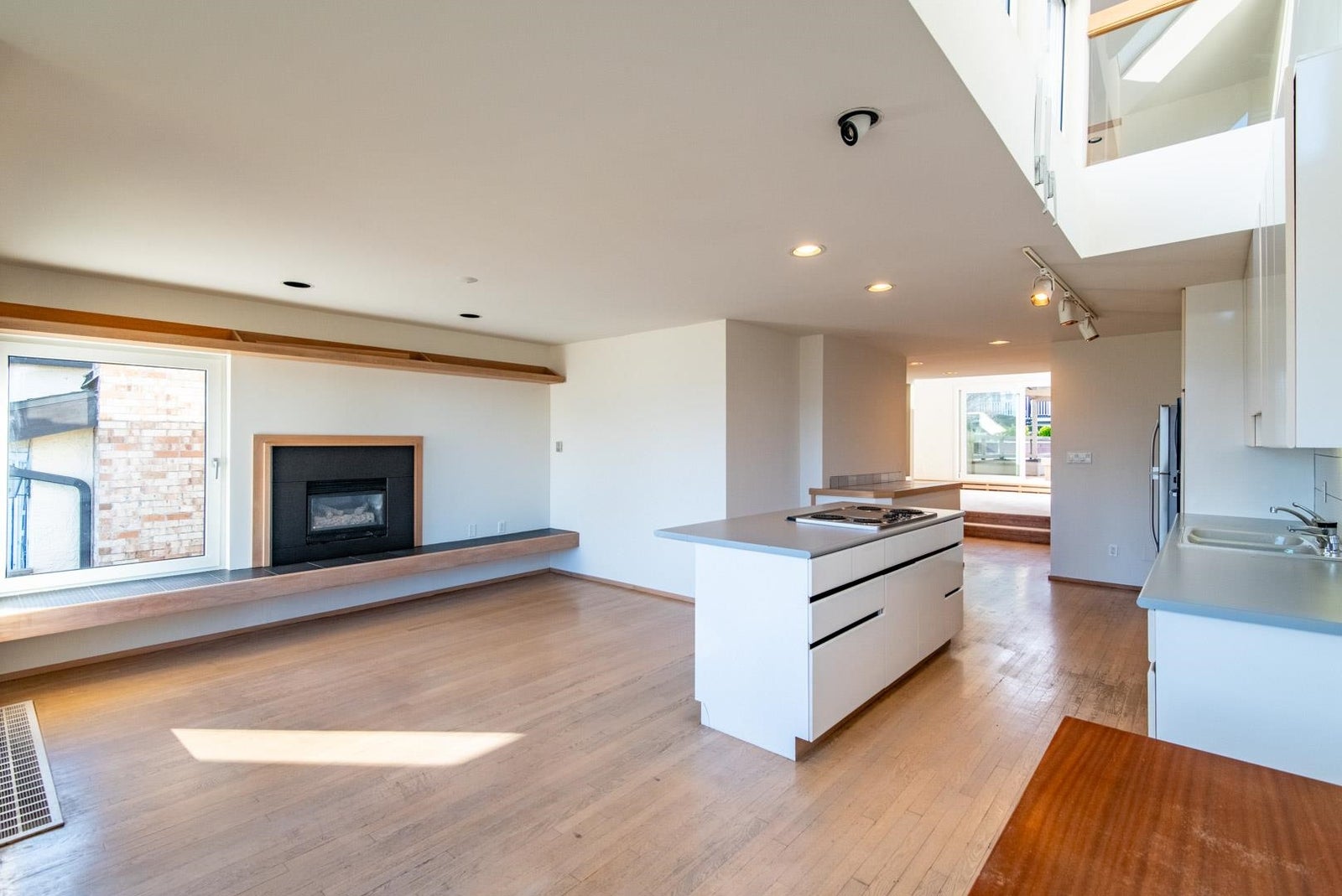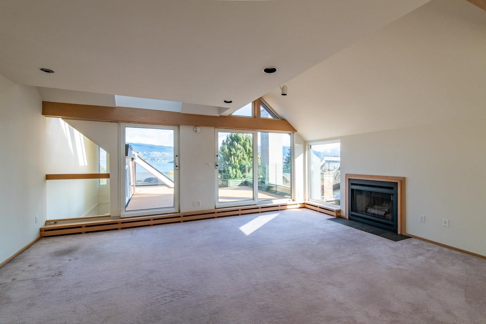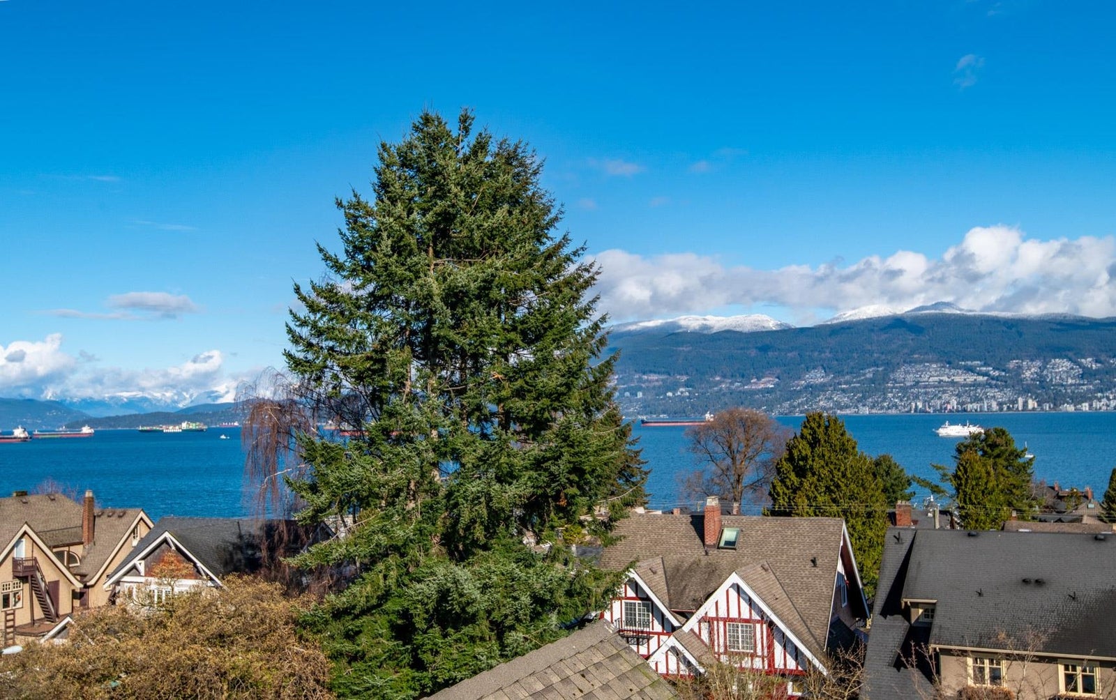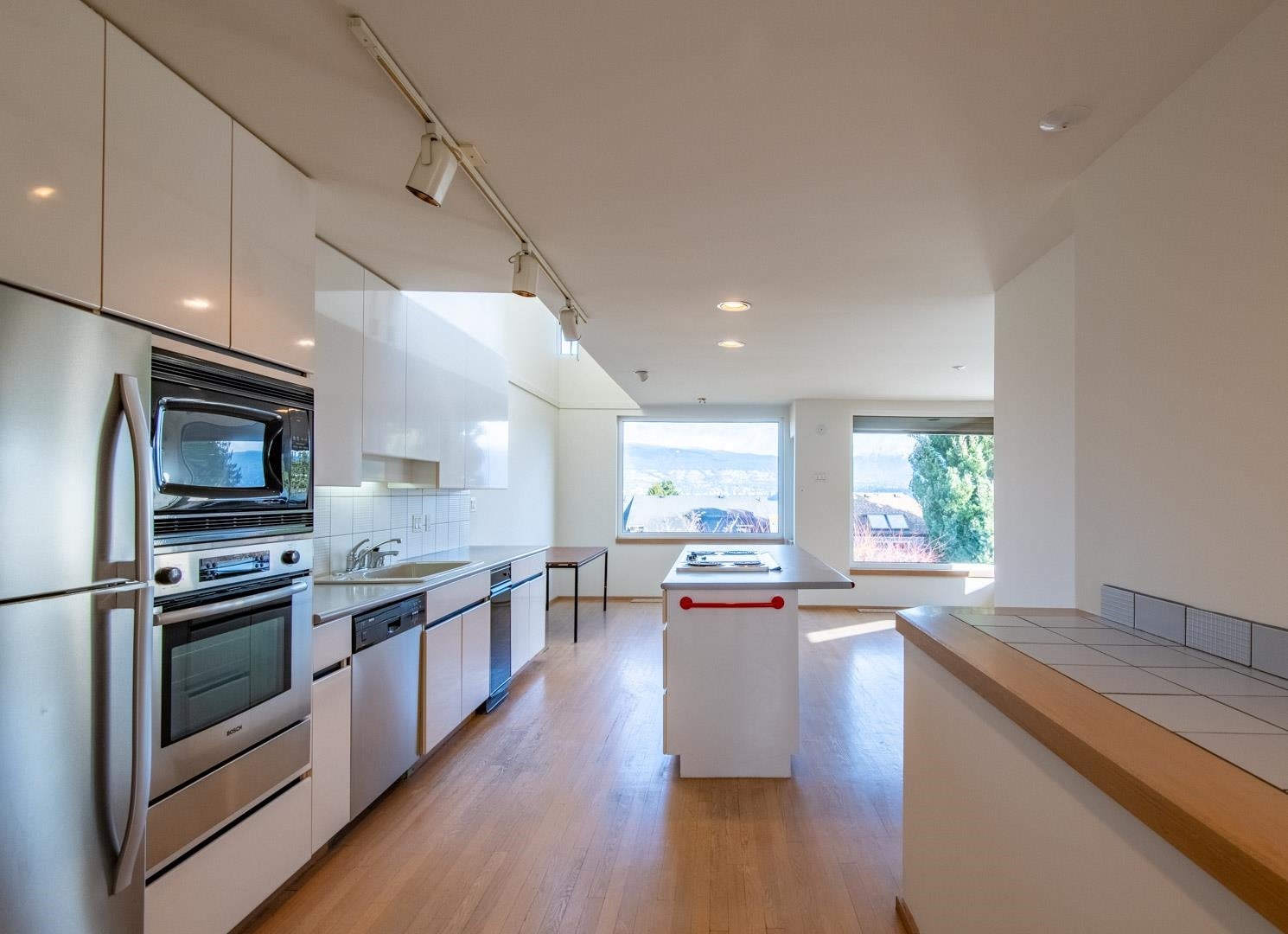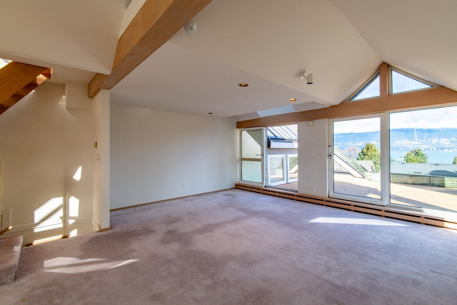 This architect designed, west coast modern, 1/2 duplex w/ spectacular views is on a 4 level split plan w/ 2400 s.f., 3brs, 4bths, open plan, soaring ceilings & huge windows & skylights for abundant natural light. The bright kitchen w/ fabulous views is ready for your creative touch w/ room for high end appliances, cabinets, island & countertops. The MBR has high ceilings, lots of closets, a huge enste bath & french doors to a priv. garden patio. It features radiant hot water heating w/ a gas boiler & 2 domestic HW tanks, a large crawl space for storage plus a garage & carport. It has oak HW flrs, is rough in for an elevator & 3 decks gives outdoor space for entertaining or watching fireworks. Walk to 4th ave., Kits beach bike path & transit to UBC & downtown.